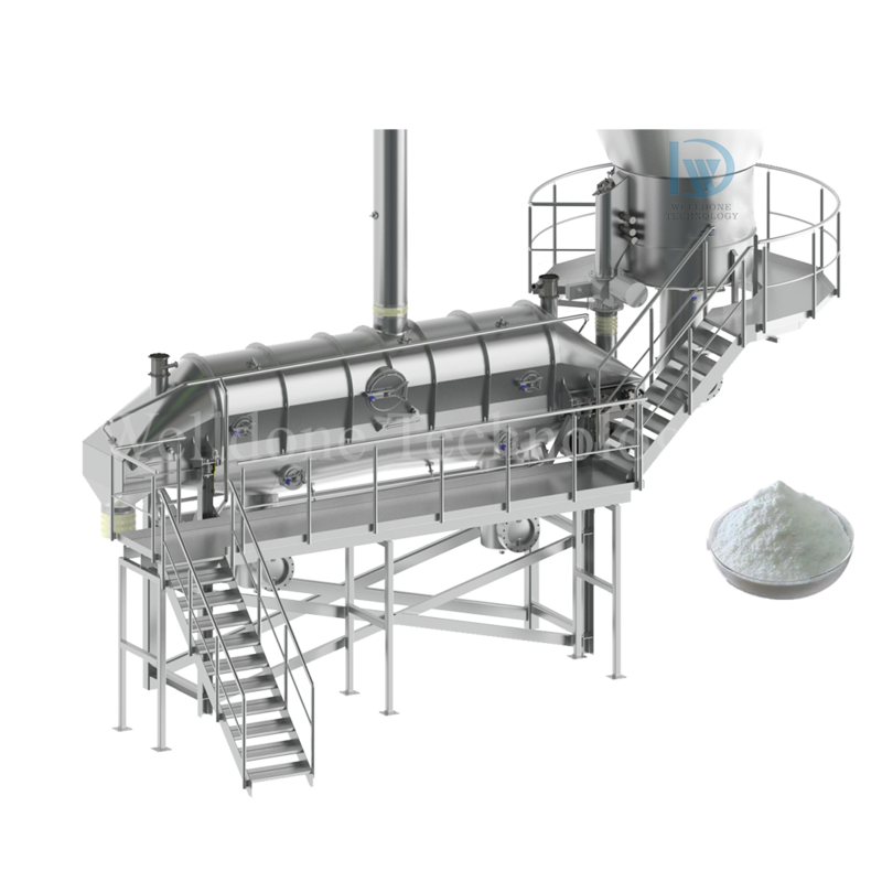 Raw material is fed into the dryer from the feeding end and moves forward continuously along under the function of vibration. The hot air penetrate fluid bed plate and dry damp raw material. Then the damp air is exhausted out through cyclone separator and dried raw material is discharged through discharge end.